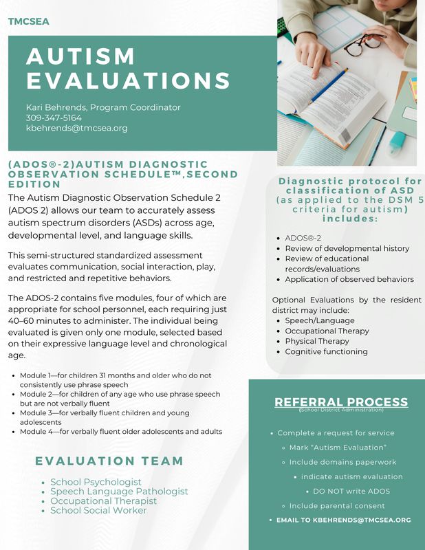 TMCSEA provides a wide array of services to districts, students, and families to assist in building effective educational support for children with autism spectrum disorders. These services include autism assistance, staff development, lending library, autism evaluations, and a variety of resources for both school and home at no cost for our member districts.